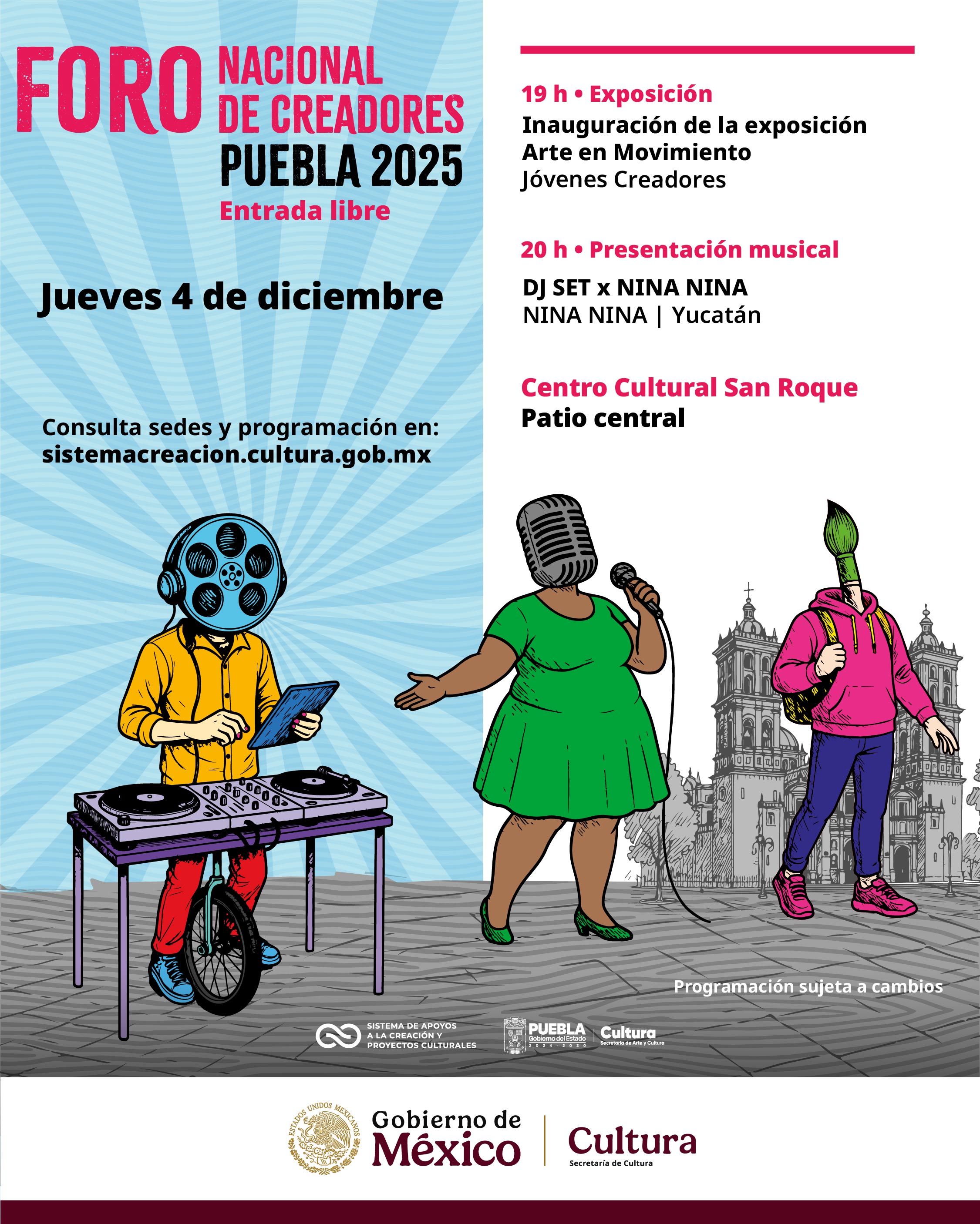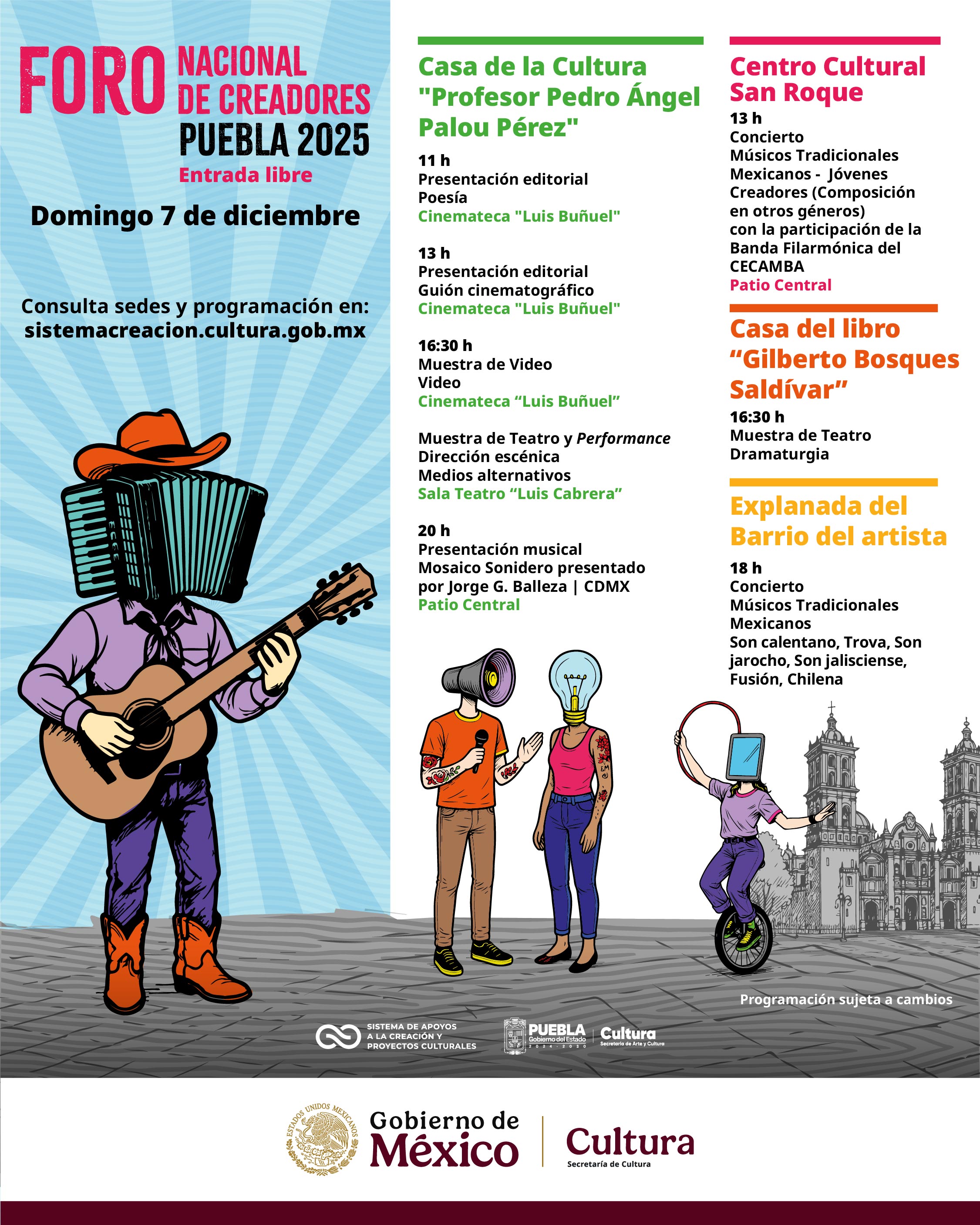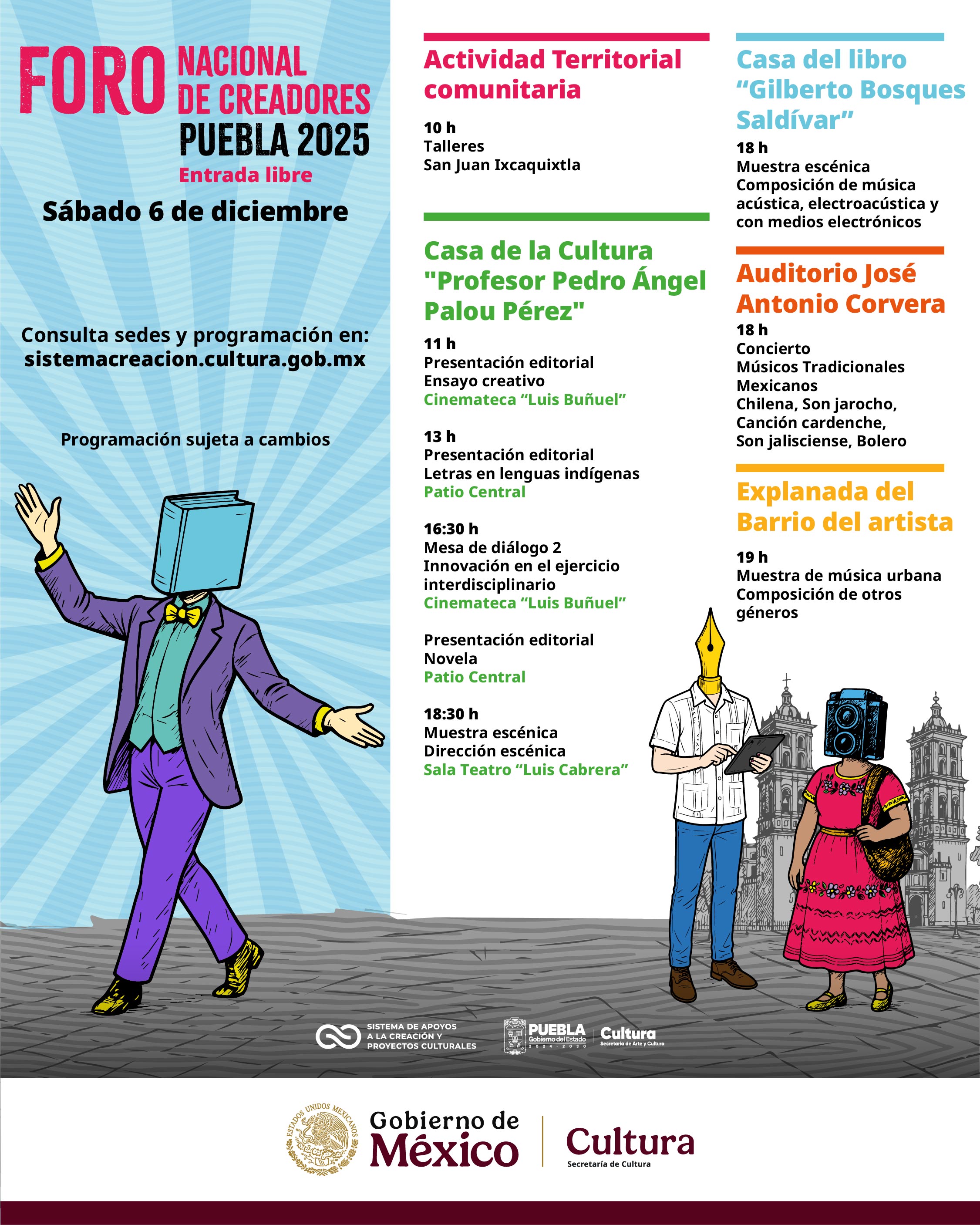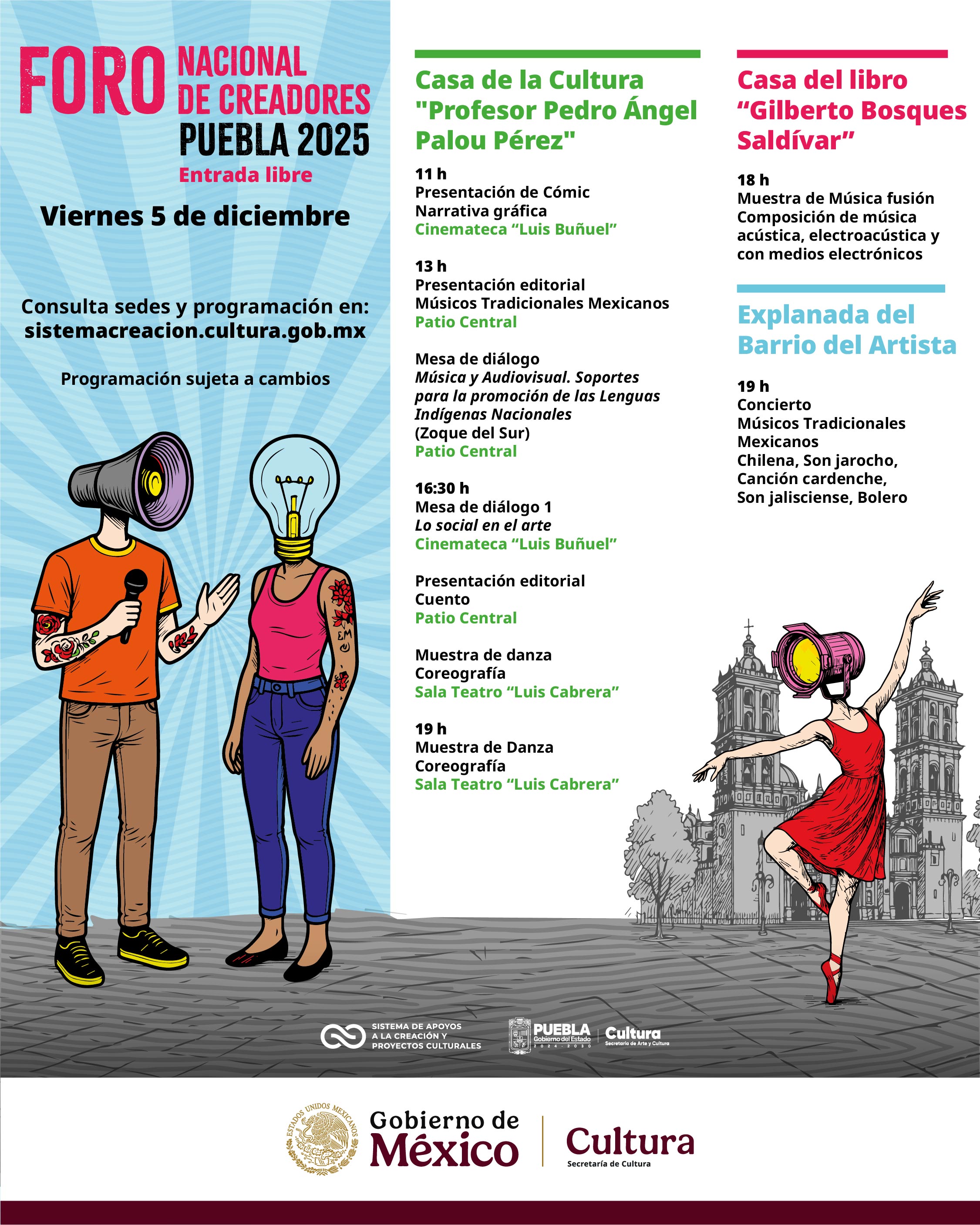 Muestra escénica • Mesas de diálogo sobre arte y sociedad • CómicPresentaciones editoriales • Conciertos • Muestra de Video • Exposición